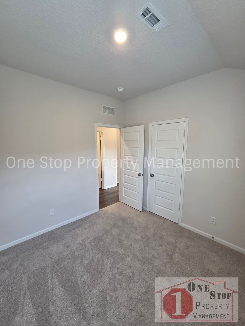 The primary bedroom suite provides a relaxing retreat with plush carpeting and a private bathroom. Two additional bedrooms offer flexible space that can be used for guests, a home office, or additional living space.