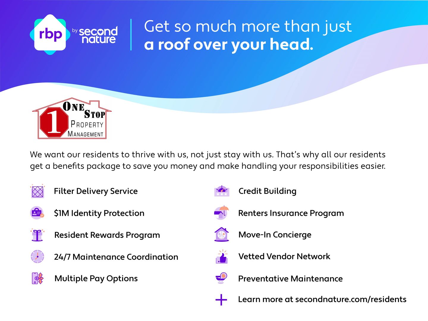 All One Stop Property Management residents are enrolled in the Resident Benefits Package (RBP) for $35.00/month which includes credit building to help boost the resident’s credit score with timely rent payments, up to $1M Identity Theft Protection, HVAC air filter delivery (for applicable properties), move-in concierge service making utility connection and home service setup a breeze during your move-in, our best-in-class resident rewards program and much more! To get the most out of the RBP residents can